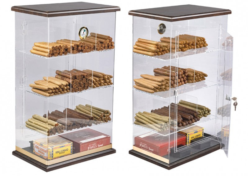 Prestige Import Group Charleston desktop humidor offers precision-controlled storage and polished presentation for serious cigar collections. Specification: This compact cabinet is finished in rich high-gloss cherry and features a framed see-through swing door and a lock with key for secure display. Seven removable drawers with adjustable dividers and ventilated tray bottoms provide organized storage and consistent humidity circulation. Interior fully lined with Spanish cedar and supplied with seven strip-style humidifiers plus an external built-in hygrometer to maintain optimal humidity. Felted bottom protects furniture while the compact footprint (12.5in W x 12.5in D x 20.5in H) fits home bars or office shelving and holds up to 210 cigars. Ventilated bottoms and individual humidification strips minimize hot spots and ensure even conditioning across all drawers. Designed for professional presentation and long-term cigar preservation, the Charleston delivers reliable humidity control and elegant retail-ready styling.