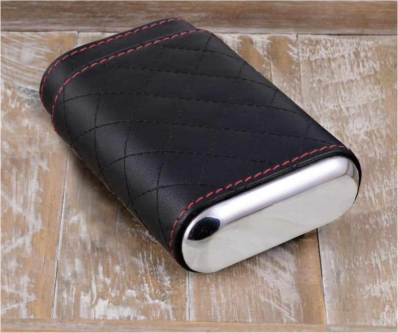 A diamond-stitched leather case engineered to protect and transport up to three cigars in a compact form factor. The black leather exterior features red contrast stitching and high-polished metal caps that resist scuffs while maintaining a refined appearance. Spanish cedar lining preserves cigar aroma and helps stabilize humidity for short-term travel. An adjustable sliding interior accommodates cigar lengths between 5.25 and 8.0 inches and fits cigars up to 7.5 inches depending on gauge. Snug internal compartments hold cigars securely to prevent rolling and abrasion during transport. The slim profile and durable construction allow pocket or bag carry for everyday use and short trips. Polished end caps and leather detailing are simple to maintain — wipe clean with a damp cloth and avoid prolonged exposure to moisture. Suited for collectors and travelers seeking compact, protective storage without electronic humidification.