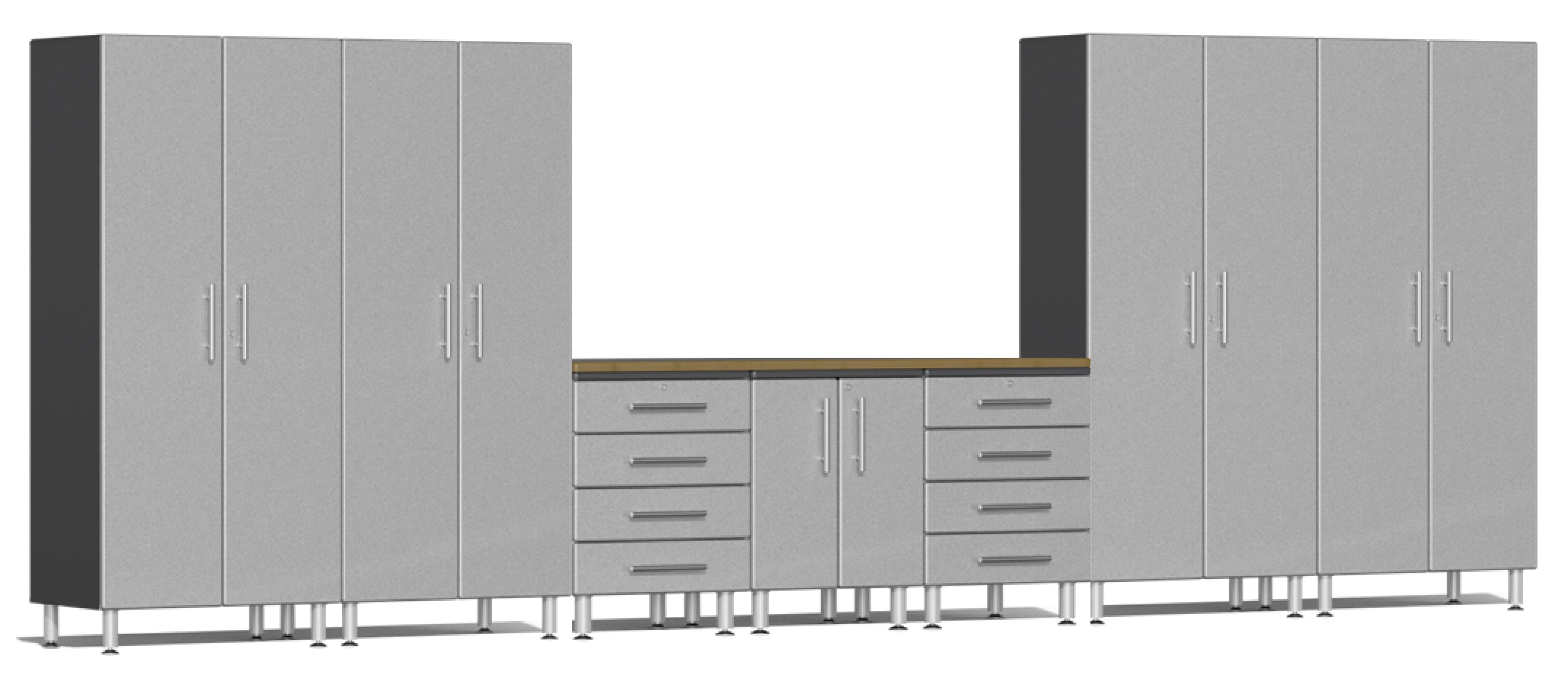 Ulti-MATE Garage 2.0 Series takes the back-to-back Consumers Digest awarded “Best Buy” cabinet line features to the next level. Eight (8) piece kit provides four (4) oversized tall cabinets to get your space clutter-free and with the included workstation with upgraded Bamboo worktop, this package checks all the boxes as the perfect storage solution. Nearly 18-ft of infinite single or multi-wall modular design options (pictured 17.73 ft) will get you creative to make the perfect design for your space (each piece is separate). Metallic car-like color facing, industrial strength 1-inch thick shelves, ball bearing drawer glides, soft-close hinges and custom shop radius profile are just a few high-end features that will have your project stand-out from the crowd.