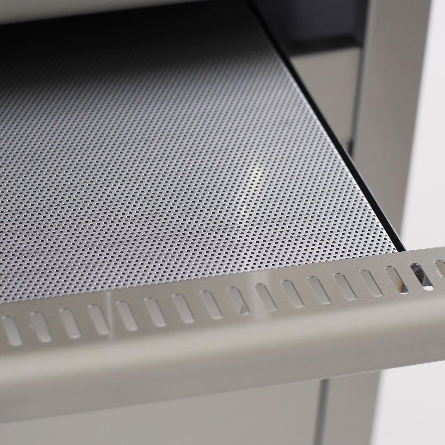 - Perforated screen sits in drip tray, essentially snuffing out flames from hot grease