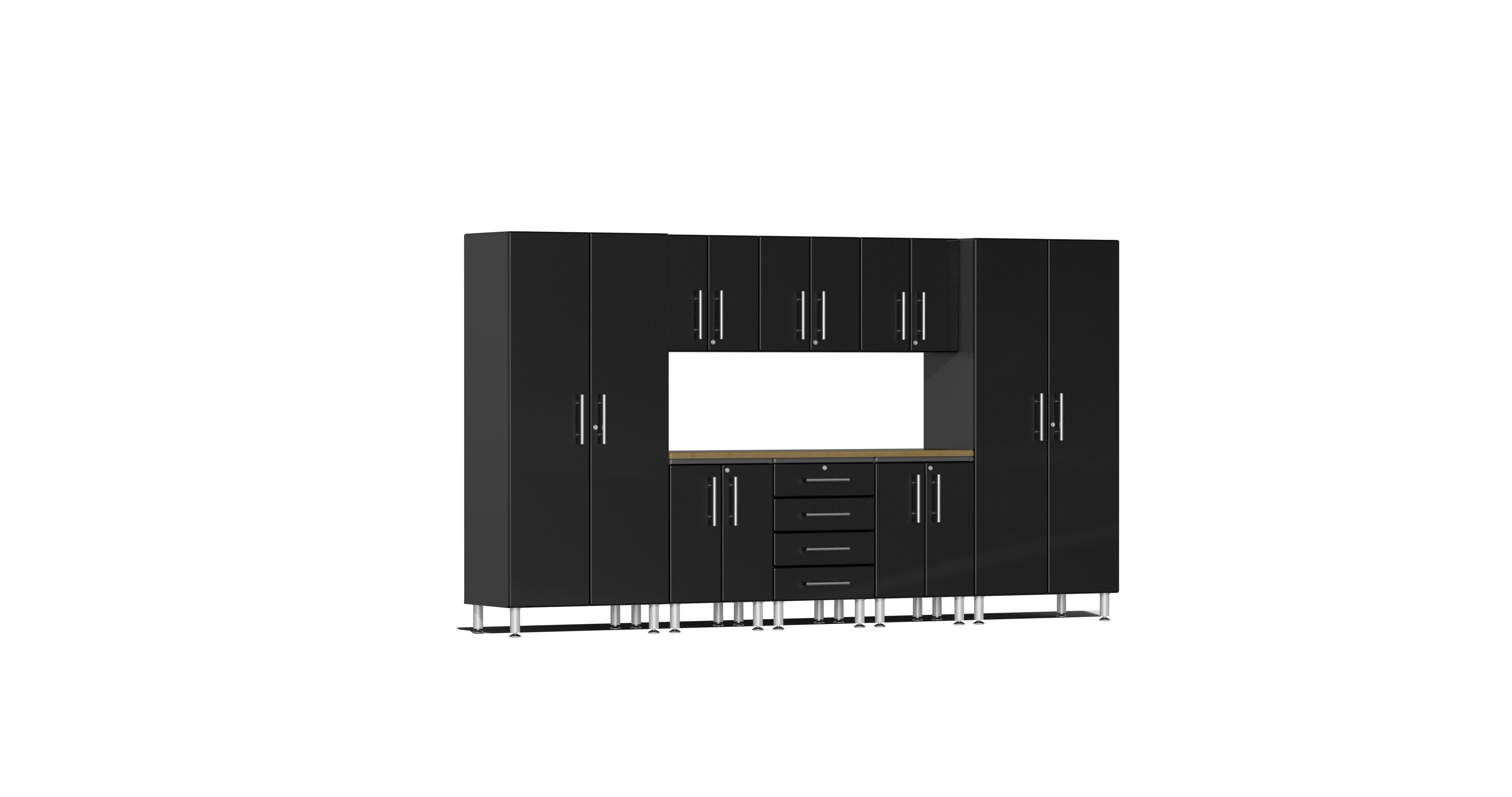 Ulti-MATE Garage 2.0 Series takes the back-to-back Consumers Digest awarded Best Buy” cabinet line features to the next level. This nine (9) piece kit with upgraded Bamboo worktop provides versatile oversized shelf, drawer and space saving wall storage to get you clutter-free quickly. Nearly 18-ft of infinite single or multi-wall expandable design options (pictured 11.8 ft). Metallic gloss car-like color facing, industrial strength 1-inch thick shelves, ball bearing drawer glides, soft-close hinges and contemporary style will have you stand out in the crowd.