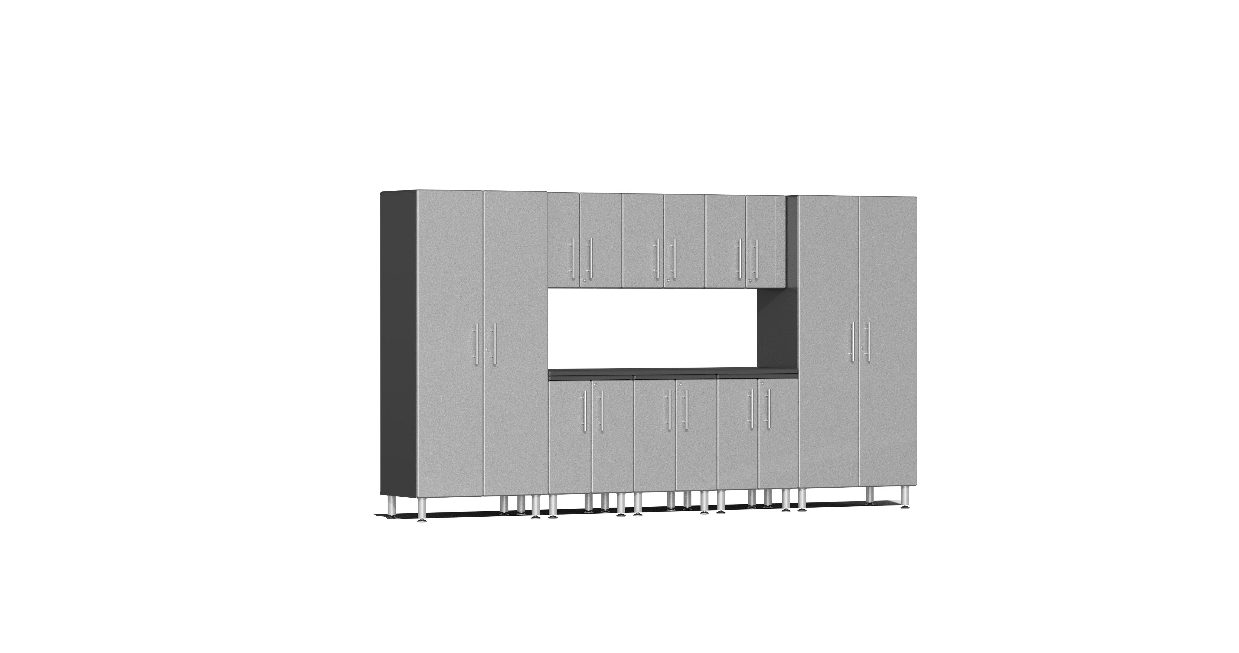 Ulti-MATE Garage 2.0 Series takes the back-to-back Consumers Digest awarded Best Buy” cabinet line features to the next level. This nine (9) piece kit with workstation provides oversized shelf organization for those not needing drawer storage. Nearly 18-ft of infinite single or multi-wall expandable design options (pictured 11.83 ft). Metallic gloss car-like color facing, industrial strength 1-inch thick shelves, soft-close hinges and industry unique style are just a few features that makes this a perfect solution for any project.