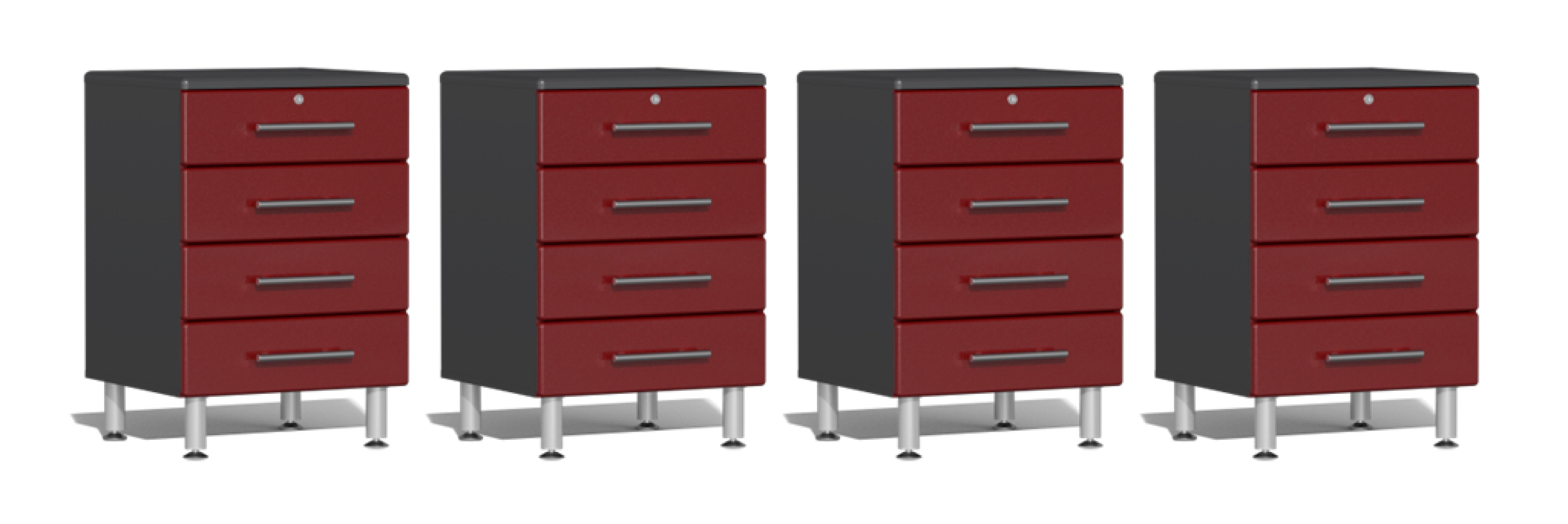 Ulti-MATE Garage 2.0 Series takes the back-to-back Consumers Digest awarded “Best Buy” cabinet line features to the next level. Four (4) piece 4-drawer base cabinet set is the perfect solution for those requiring drawer base storage for one or multi-wall design options. Each 23.6-inch wide cabinet provides choice of five (5) industry unique metallic gloss color facing over Grey cabinet, radius profile, integrated recessed top, full extension ball bearing drawer glides and much more to meet the demands of any home or business application. Standout from the crowd with these next level designed cabinets.