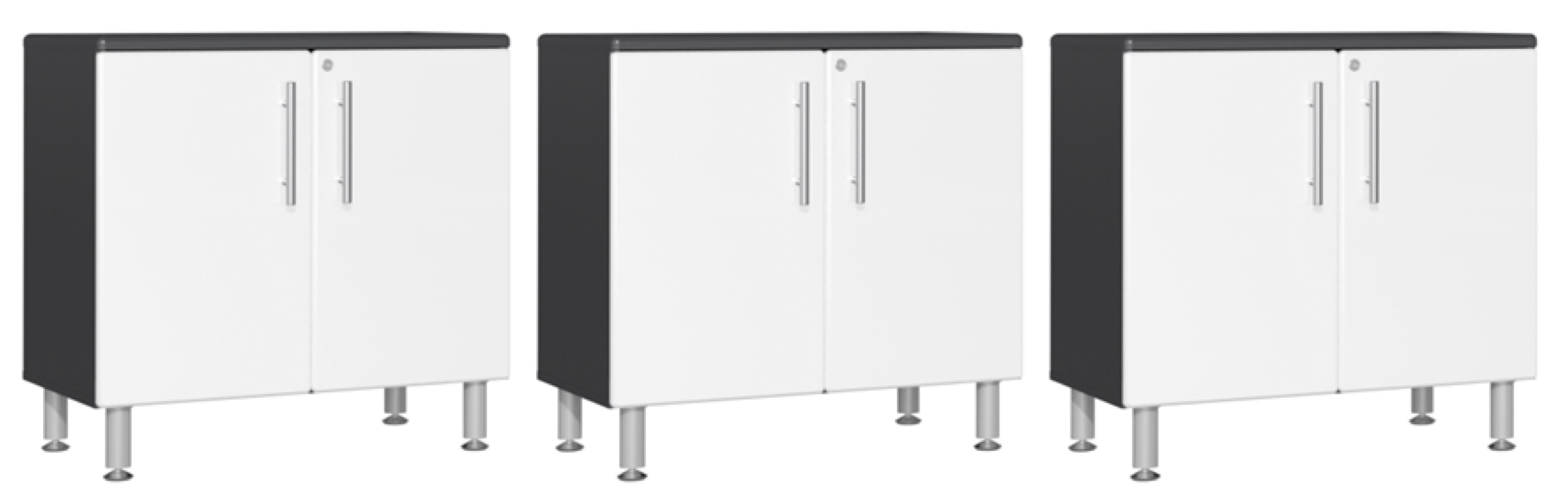 Start building your perfect garage with one click. This combo combines 1 four-door base cabinet with stainless steel worktop, 1 one-door wall cabinet and 1 pegboard back wall and posts.