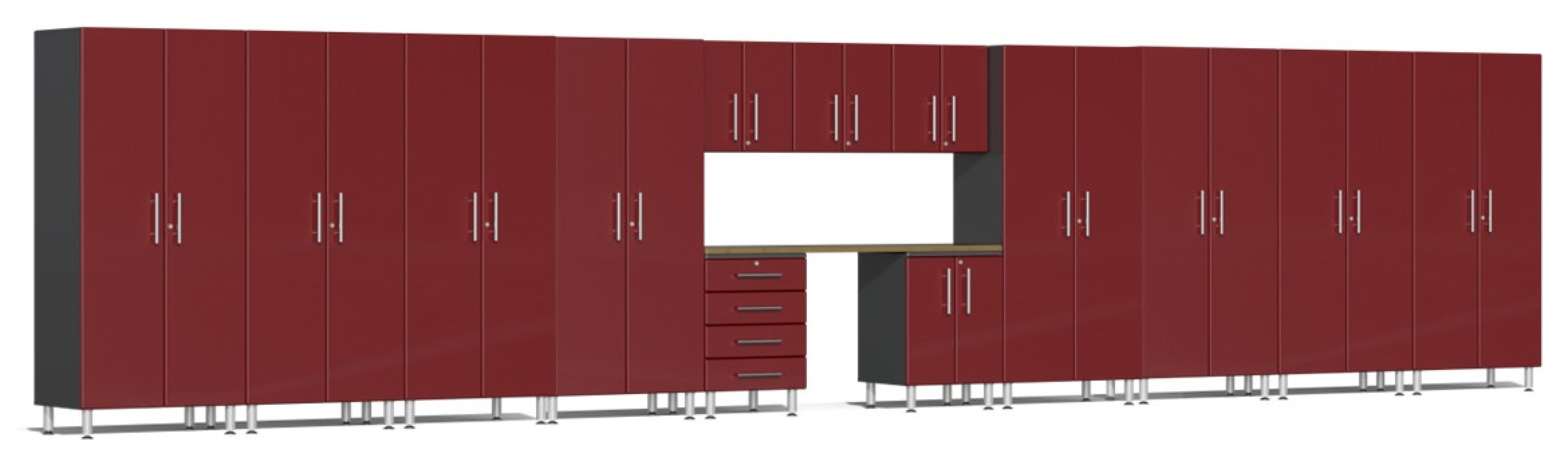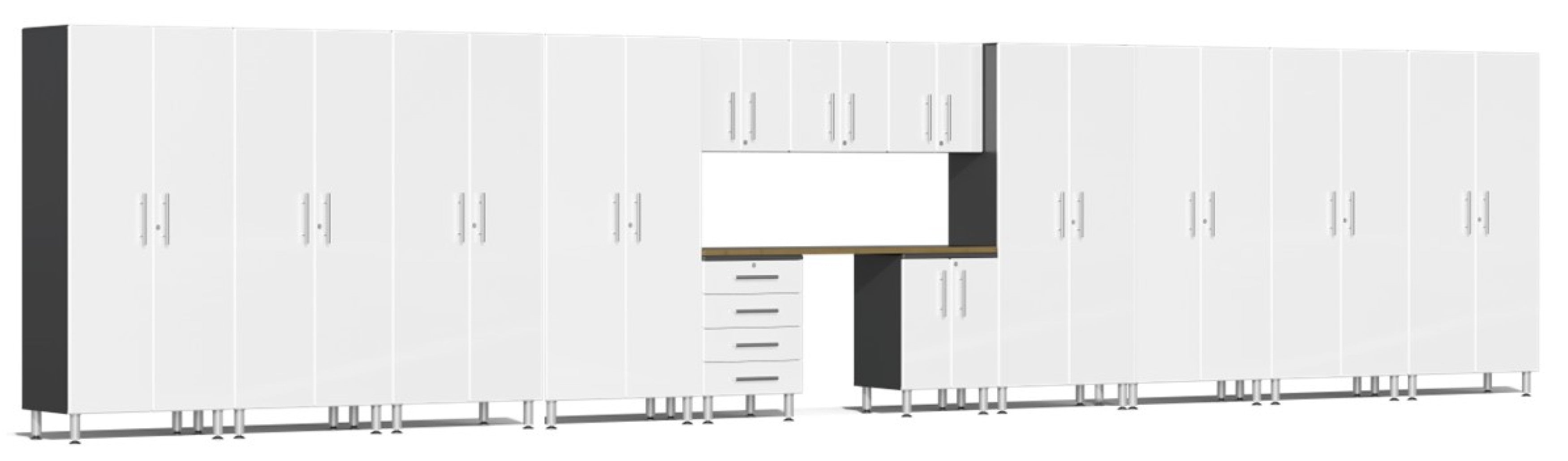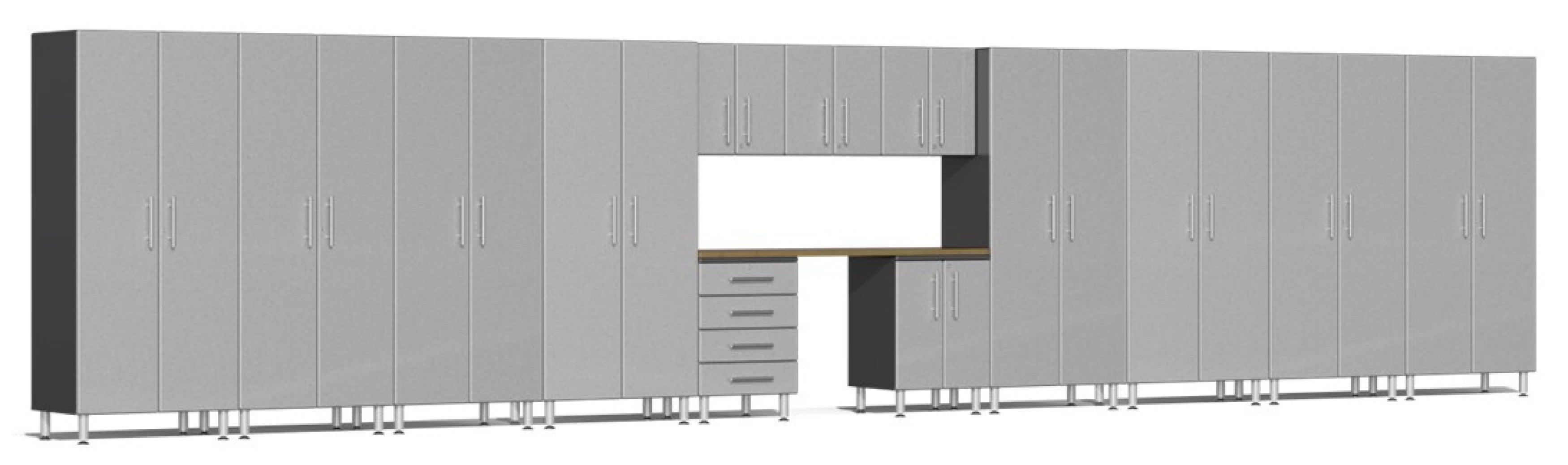 Ulti-MATE Garage 2.0 Series takes the back-to-back Consumers Digest awarded “Best Buy” cabinet line features to the next generation. Fourteen (14) piece jumbo-set provides massive oversized storage through eight (8) tall cabinets complimented with a workstation and space saving wall cabinets providing a next-level storage solution for the most discerning garage, workshop or commercial application. Pictured (29.57-feet wide) single wall design option is just one (1) of infinite single or multi-wall design options you can create through modular design (each cabinet is separate). Choice of five (5) head-turning metallic facing color options, industrial strength 1-inch thick shelves, radius profile for custom shop style, soft-close hinges and more will have your project stand-out from the crowd in style, strength and value that's unmatched.
