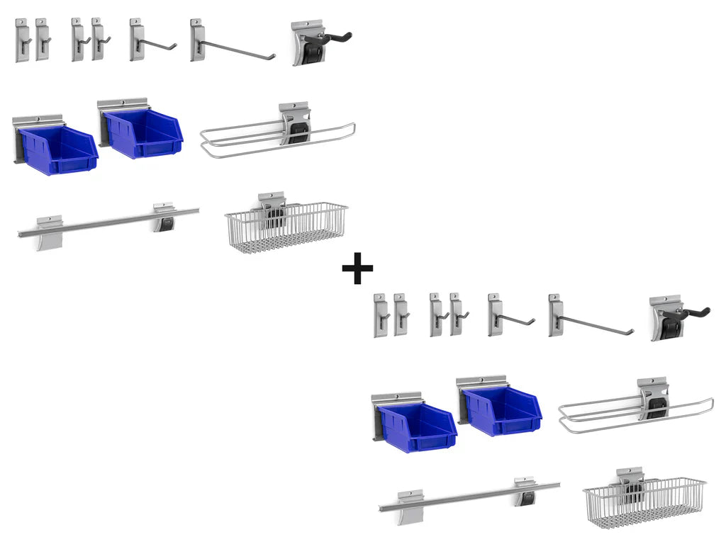 Make the most of your slatwall system, and keep your tools and equipment stored within easy reach, with the set of two NewAge Products 12-Piece Slatwall Accessory Kits. Designed for use on NewAge Products Slatwall Backsplash and Pro Series Slatwall, and is also compatible with most 3 in. on-center slatwall systems, the wide variety of hooks and baskets will keep all of your garage items organized and easy to locate. Single Hooks of different lengths provide a place to keep your gardening tools or wrenches, while the Mini Basket keeps your cleaning supplies and spray bottles safely out of reach of kids. The Paper Towel Holder let’s you tear sheets one-handed for quick tidying, and the Magnetic Toolbar is a great place to store your often-used hand tools, with the magnetic strength to hold pliers, clamps and screw drivers. Built with heavy duty steel for extra strength, and a powder-coat silver gloss finish that looks great in any space, the 12-Piece Slatwall Accessory Kit helps to keep your garage efficiently organized.