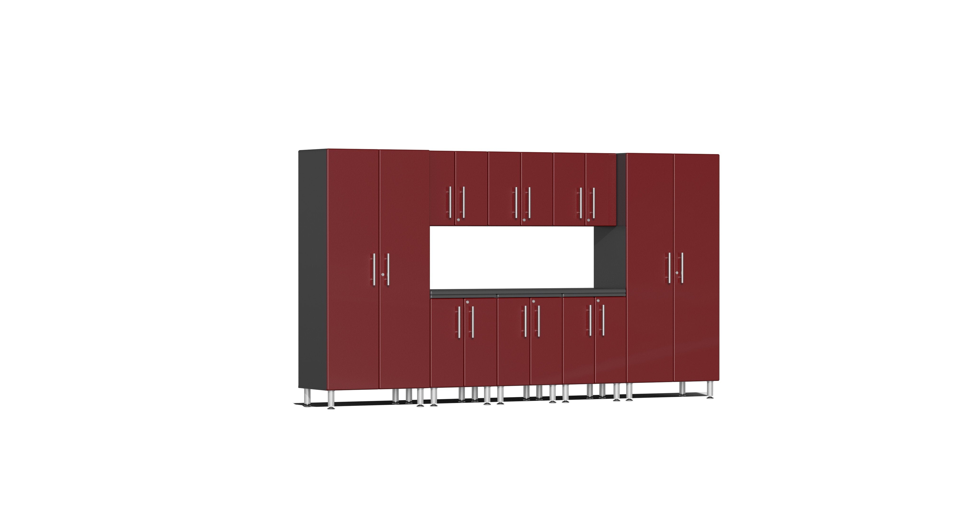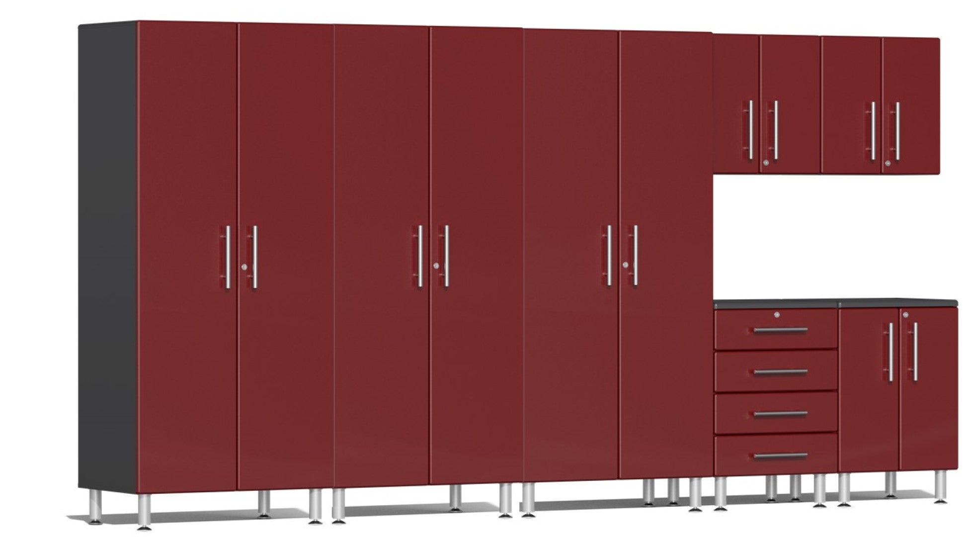 Ulti-MATE Garage 2.0 Series takes the back-to-back Consumers Digest awarded Best Buy” cabinet line features to the next level. This seven (7) piece kit offers three (3) oversized tall cabinets, one (1) 4-drawer base cabinet, one (1) 2-door base cabinet and two (2) space saving 2-door wall cabinets. Modular design provides infinite single or multi-wall design options. Unique metallic gloss car color facing over Grey cabinet, industrial strength and high-end hardware are a few features that will have your garage, workshop or business stand out from the crowd.
