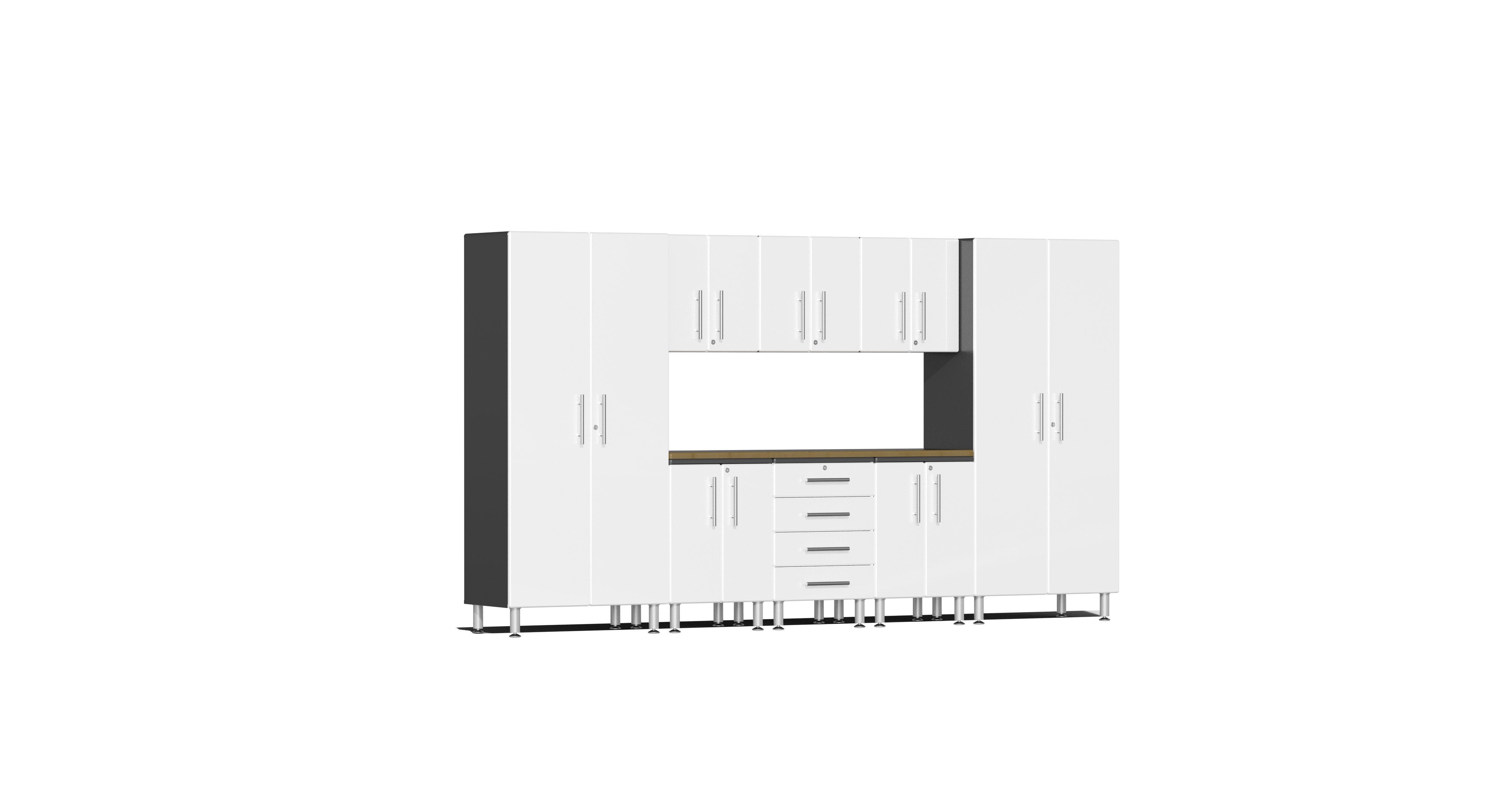 Ulti-MATE Garage 2.0 Series takes the back-to-back Consumers Digest awarded Best Buy” cabinet line features to the next level. This nine (9) piece kit with upgraded Bamboo worktop provides versatile oversized shelf, drawer and space saving wall storage to get you clutter-free quickly. Nearly 18-ft of infinite single or multi-wall expandable design options (pictured 11.8 ft). Metallic gloss car-like color facing, industrial strength 1-inch thick shelves, ball bearing drawer glides, soft-close hinges and contemporary style will have you stand out in the crowd.