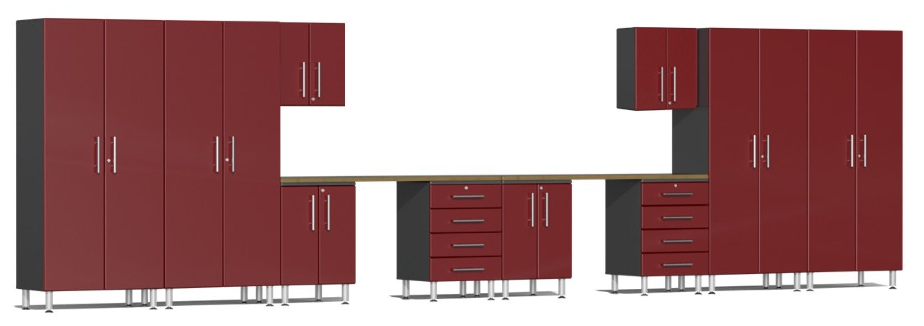 Ulti-MATE Garage 2.0 Series takes the back-to-back Consumers Digest awarded “Best Buy” cabinet line features to the next generation. This nine (9) piece kit with upgraded solid Bamboo worktop provides a great a popular mix of oversized and space saving cabinets for infinite single or multi-wall modular design options (pictured design 11.82 ft wide). Industry unique metallic gloss car-like color facing, industrial strength 1-inch thick shelves, soft-close hinges and radius profile are a few high-end features that will take your residential or commercial project to the next level.