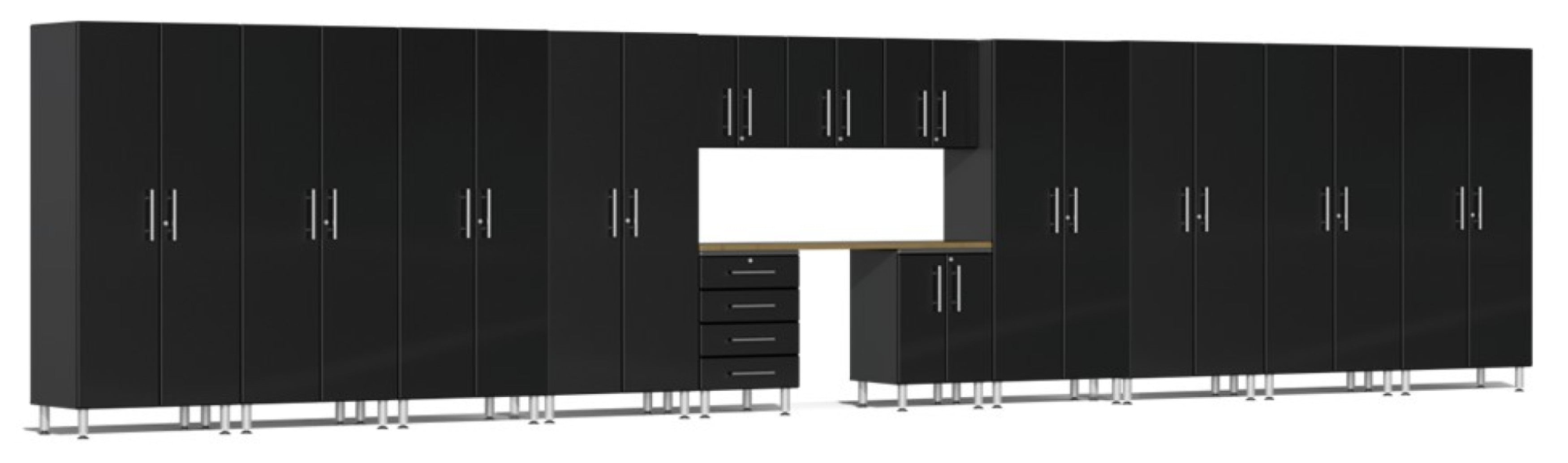 Ulti-MATE Garage 2.0 Series takes the back-to-back Consumers Digest awarded “Best Buy” cabinet line features to the next level. Eighteen (18) piece modular set provides infinite single or multi-wall designs option of nearly 36-feet (23.63-ft pictured) to push your layout creativity to the next level. Contemporary metallic car color facing, industrial strength 1-inch thick shelves to handle heavy loads and custom shop radius profile are just a few high-end features that will exceed the most discerning garage or workshop project demands.