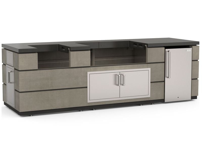Constructed from Glass Fiber Reinforced Concrete (GFRC), this 9.5-foot Fire Magic pre-fab island delivers a durable, crack-resistant exterior engineered for outdoor kitchens. Polished Black Lava countertop and smoke-colored GFRC panels provide a contemporary aesthetic with stainless appliance openings that integrate Fire Magic grills and accessories. The island ships as an easily assembled on-site system sized for a 36-inch grill, and includes premium refrigerator (3598-DR), double access doors (53938SC 16"h x 39"w), single vertical access door (53920SC-L) and a stainless double timer box (5521-12T). This package is compatible with Echelon and Aurora built-in grills and power burners sold separately to let buyers customize cooking capacity. Manufactured for longevity, GFRC combines alkali-resistant glass fiber with acrylic polymer to resist cracking while maintaining a lighter mass than poured concrete. Warranty coverage includes lifetime on cast stainless burners, multi-year coverage on key stainless components and limited labor allowance per Fire Magic terms. Overall assembled footprint is 115 in wide x 35 in deep x 42.5 in high and the island is designed freestanding for integration into built outdoor kitchens. Free shipping is offered and professional installation is recommended for secure mounting and utility connections.