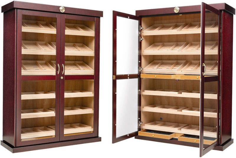 A furniture-quality commercial cabinet humidor engineered to store and display up to 4,000 cigars while maintaining stable humidity. Rich dark cherry exterior finish pairs with full Spanish cedar lining to preserve tobacco oils and enable controlled aging. Dual framed glass doors and an external hygrometer provide convenient monitoring and secure presentation for retail or private collections. Twelve oversized removable trays with 24 adjustable dividers and four pull-out drawers accept loose cigars or full boxes for flexible merchandising. Twenty-four included humidifiers and a rear wiring port support reliable humidity management and optional electrical accessories. A lock-and-key set secures inventory while optional integrated LED lighting uniformly illuminates trays for premium presentation. The design supports both flat and angled storage configurations and allows tray removal for direct box display. Construction emphasizes long-term cigar preservation and efficient commercial display functionality.