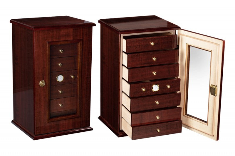Prestige Import Group Charleston desktop humidor offers precision-controlled storage and polished presentation for serious cigar collections. Specification: This compact cabinet is finished in rich high-gloss cherry and features a framed see-through swing door and a lock with key for secure display. Seven removable drawers with adjustable dividers and ventilated tray bottoms provide organized storage and consistent humidity circulation. Interior fully lined with Spanish cedar and supplied with seven strip-style humidifiers plus an external built-in hygrometer to maintain optimal humidity. Felted bottom protects furniture while the compact footprint (12.5in W x 12.5in D x 20.5in H) fits home bars or office shelving and holds up to 210 cigars. Ventilated bottoms and individual humidification strips minimize hot spots and ensure even conditioning across all drawers. Designed for professional presentation and long-term cigar preservation, the Charleston delivers reliable humidity control and elegant retail-ready styling.