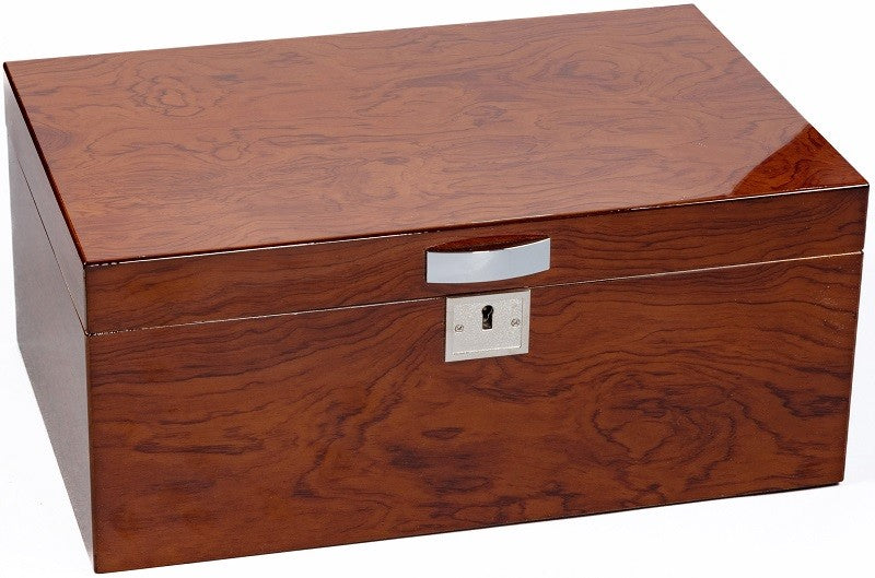 Princeton desktop humidor is finished in ultra-deep lacquered bubinga and designed to store and condition up to 130 premium cigars. The interior is fully Spanish cedar lined with a removable cedar tray and two adjustable dividers to organize varied ring gauges. Polished chrome-plated hardware, internal locking hinges and a chrome lock with key secure the lid while preventing over-extension. Humidity control is provided by a silver-frame hygrometer with calibration and a magnetic silver humidifier that mounts to the invisible steel-lined lid. The construction balances aesthetic appeal and functionality for retail displays, home bars, or tobacconist counters. Exterior dimensions measure 15 in W x 10 in D x 6.5 in H, offering a compact footprint while maximizing capacity. Packaging and estimated shipping weight are optimized for safe delivery and are approximately 8 lb when boxed. Includes removable cedar accessories, chrome key lock, and is compatible with standard humidification supplies for long-term cigar preservation.