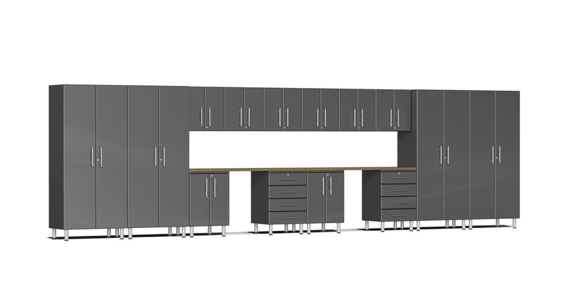 Ulti-MATE Garage 2.0 Series takes the back-to-back Consumers Digest awarded Best Buy” cabinet line features to the next level. This jumbo sixteen (16) piece kit with dual workstations provides nearly 36-ft of infinite design options on single or multi-wall designs (23.65-ft pictured). Metallic gloss car-like color facing, industrial strength 1-inch thick shelves, smooth operating ball bearing drawer glides, soft-close hinges, radius profile and contemporary style will have you the envy to all.