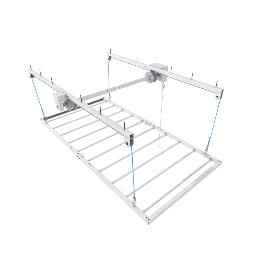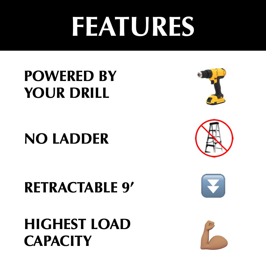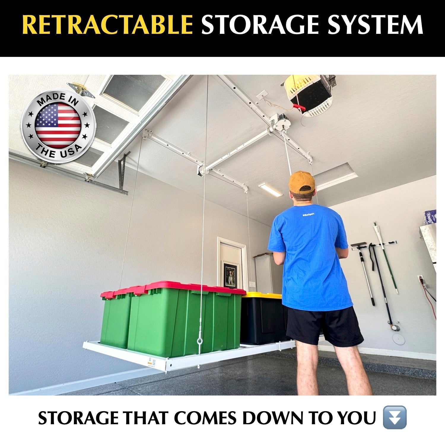 The Retractable 4x8 is the first retractable overhead garage storage rack of its kind. Unlike the expensive competitors, our retractable system does not require a power source or technology (phone app). Rather, it is raised/lowered using your drill, or a hand-crank. Forget your ladder, because our retractable system comes down to you. The Retractable 4x8 was engineered to hold 700 lbs of distributed weight, with cables (for support). Finally, a retractable unit that does not swing!